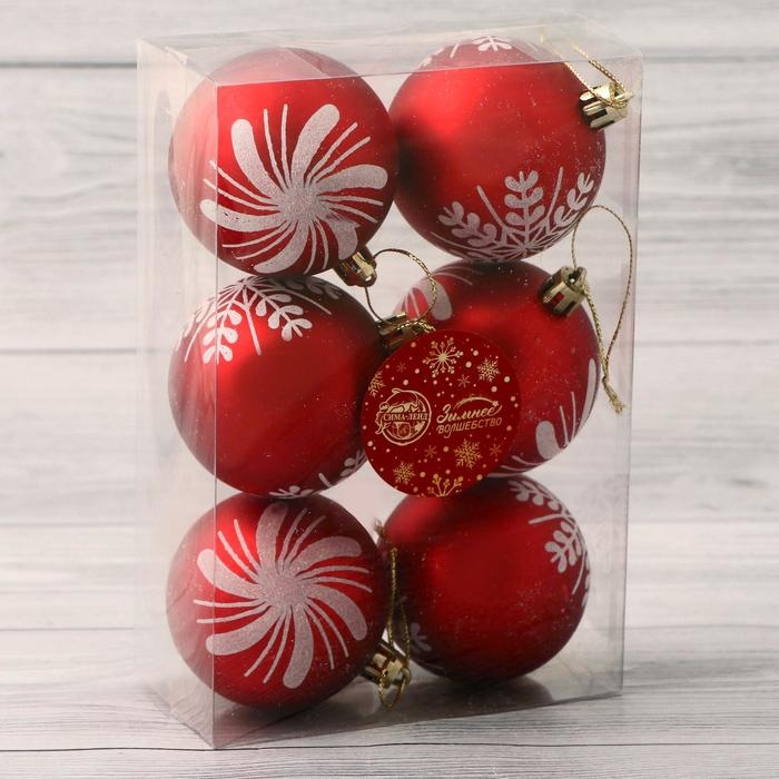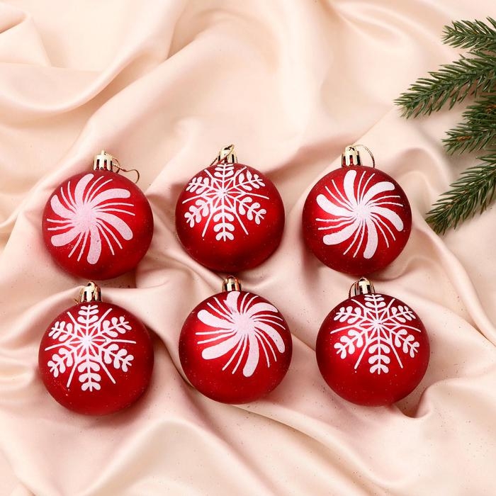 Набор шаров пластик d-6 см, 6 шт "Снежинки ассорти" красный