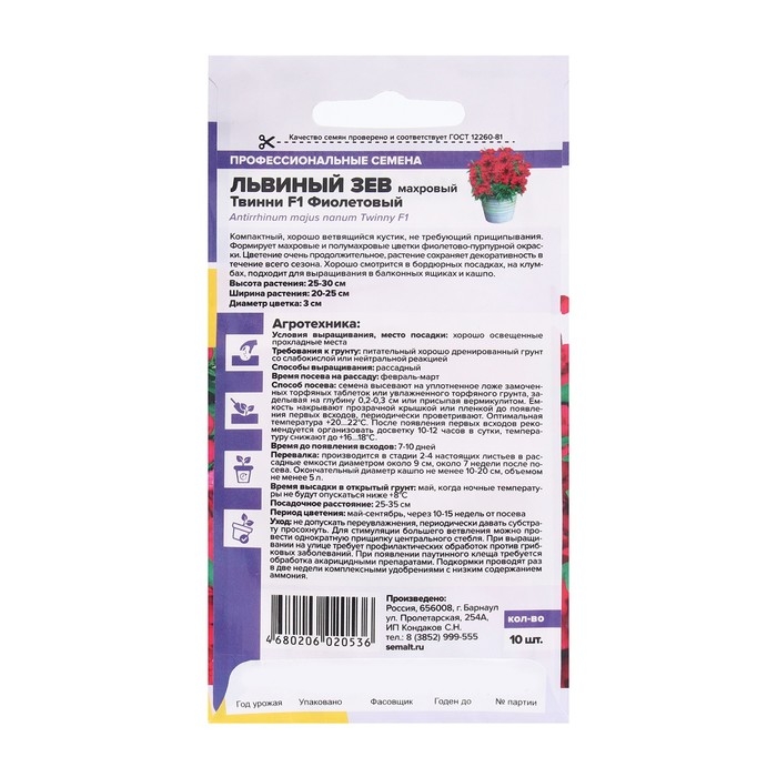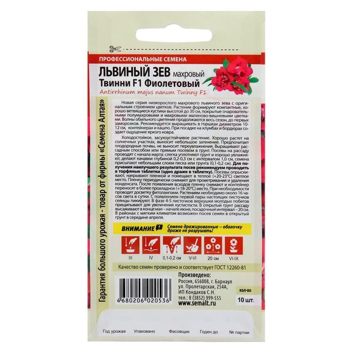 Семена цветов Львиный зев Твинни "Фиолетовый", махровый, Сем. Алт, ц/п, 5 шт