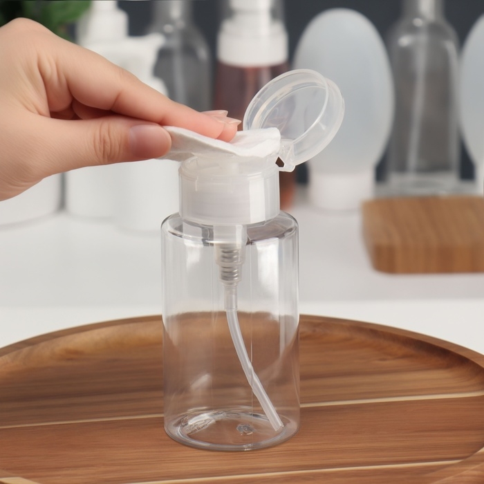 В такой баночке удобно хранить средство для снятия лака, лосьон для лица и другие косметические составы: они не выветрятся и не вытекут. Ёмкостью очень легко пользоваться: просто положите сверху ватный диск и нажмите на помпу, чтобы он пропитался содержимым. Такая система уменьшает расход материала и делает процедуру быстрее и приятнее.