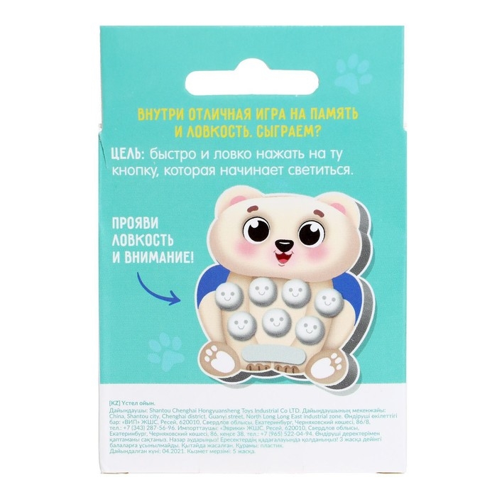 «Лови и нажимай» — это настольная игра на память и ловкость. Ребёнку необходимо быстро нажать на ту кнопку, которая начинает светиться. Игрушка светится и воспроизводит звук.