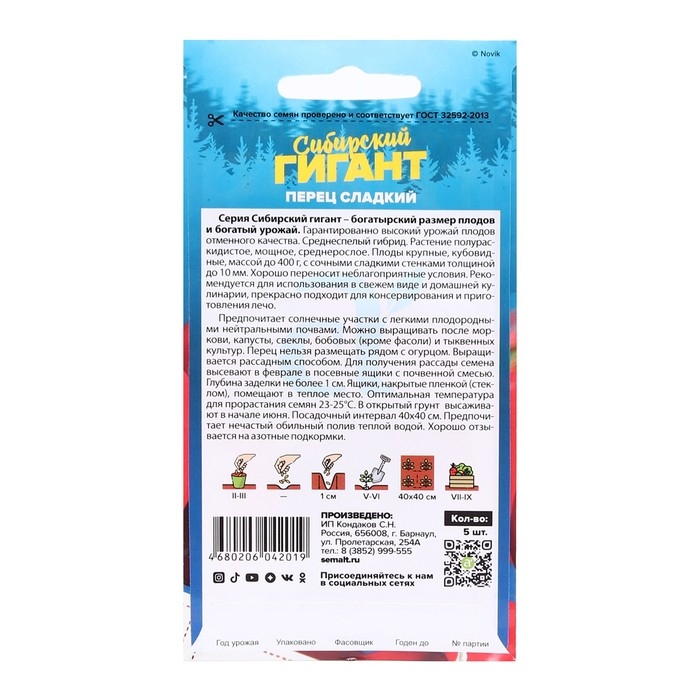 Серия Сибирский гигант - богатырский размер и богатый урожай. Гарантированно высокий урожай плодов отменного качества. Среднеспелый гибрид. Растение полураскидистое, мощное, среднерослое. Плоды крупные, кубовидные, массой до 400 г, с сочными сладкими стенками толщиной до 10 мм. Хорошо переносит неблагоприятные условия. Рекомендуется для использования в свежем виде и домашней кулинарии, прекрасно подходит для консервирования и приготовления лечо. Предпочитает солнечные участки с легкими плодородными нейтральными почвами. Можно выращивать после моркови, капусты, свеклы, бобовых (кроме фасоли) и тыквенных культур. Перец нельзя размещать рядом с огурцом. Выращивается рассадным способом. Для получения рассады семена высевают в феврале в посевные ящики с почвенной смесью. Глубина заделки не более 1 см. Ящики, накрытые пленкой (стеклом), помещают в теплое место. Оптимальная температура для прорастания семян 23-25°С. В открытый грунт высаживают в начале июня. Посадочный интервал 40х40 см. Предпочитает нечастый обильный полив теплой водой. Хорошо отзывается на азотные подкормки.