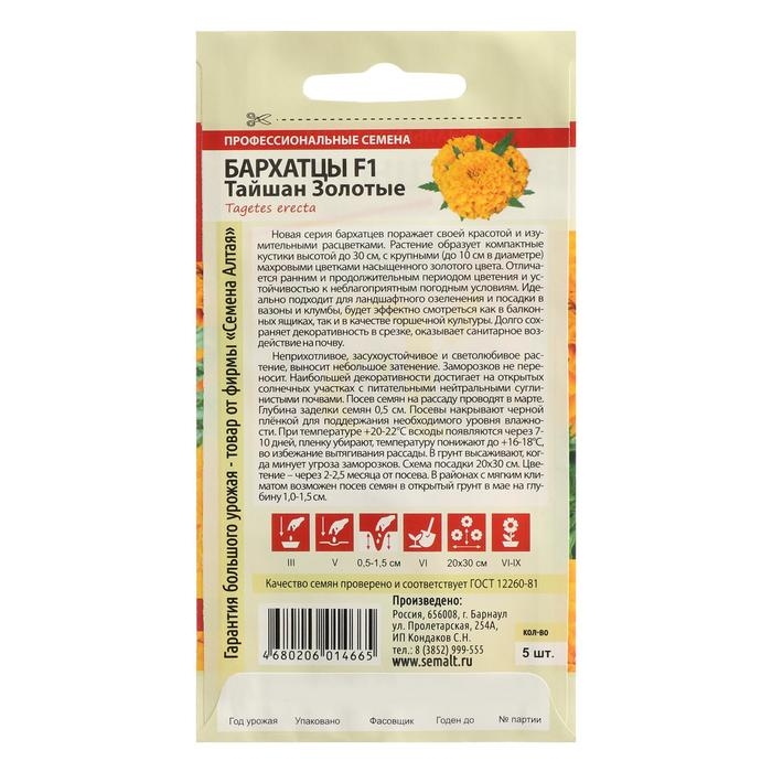 Семена цветов Бархатцы "Тайшан", золотые, Сем. Алт, ц/п, 5 шт