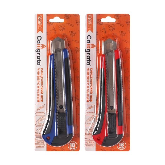 Нож канцелярский 18 мм пластик с мет., направляющ, фиксатор, прорезиненный МИКС в блистере