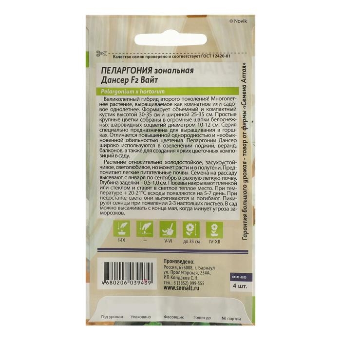 Семена цветов Пеларгония "Дансер Вайт", зональная, Сем. Алт, ц/п, 4 шт