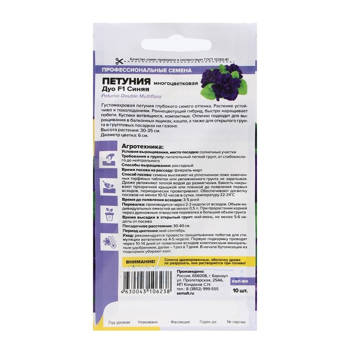 Эффектная махровая петуния с нарядной окраской цветков. Кустики ветвящиеся компактные, высотой около 30 см, усыпаны массой махровых фиолетово-синих цветков с гофрированными лепестками. Растение устойчиво к похолоданиям и непогоде. Цветение пышное и продолжительное, с июня до осенних холодов. Чудесно смотрится в балконных ящиках, цветниках, в групповых посадках на газоне. Светолюбивое и достаточно засухоустойчивое растение. Предпочитает легкие плодородные, хорошо дренированные почвы. Посевы на рассаду проводят с середины февраля. Семена равномерно распределяют по поверхности субстрата, не заделывая, а лишь слегка вдавливая в грунт. Для получения наилучшего результата посев рекомендуем проводить в торфяные таблетки (одно драже в таблетку). Посевы увлажняют из распылителя и накрывают стеклом для поддержания постоянной влажности. Емкость помещают в светлое теплое место (+22-24°С). Всходы появляются через 10-15 дней, стекло убирают. Февральским посевам требуется дополнительная подсветка. Пока всходы мелкие, их лучше не поливать, а опрыскивать, избегайте попадания на них прямых солнечных лучей. Пикировку проводят в фазе 1-2-х настоящих листочков. В открытый грунт рассаду высаживают в конце мая - начале июня, когда минует угроза возвратных заморозков. Посадочный интервал – 30-40 см. Возможно сохранение растений зимой в освещенном помещении при температуре около +12°С с предварительной обрезкой побегов. Внимание! Семена дражированные - оболочку драже не разрушать!