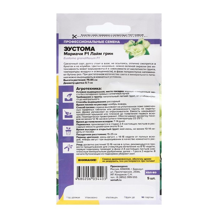 Эустома, лизиантус, «ирландская роза» – вот неполный перечень названий этого прекрасного многолетника, который в открытом грунте выращивается как летник. Полураспустившиеся цветки похожи на бутоны роз. Стебли высотой 75-100 см покрыты крупными, диаметром до 7 см, нежно-салатовыми супермахровыми цветками. Эустома займет достойное место среди Ваших комнатных растений, также она широко используетсядля оформления клумб, рабаток, бордюров. Благодаря прочным лепесткам долго сохраняет свежесть в срезке и хорошо переносит транспортировку.Светолюбивое растение, требует продолжительного светового дня. Предпочитает плодородные легкие, хорошо дренированные почвы с нейтральным уровнем pH. Посев на рассаду проводят с января по март. Для получения наилучшего результата посев рекомендуем проводить в торфяные таблетки диаметром около 40 мм (одно драже в таблетку). В набухших торфяных таблетках подготавливают ложе для посева, немного уплотняя центр. Важно, чтобы семена оставались на поверхности, так как они светочувствительны. После посева семена накрывают пленкой или помещают в мини-парничок, обеспечивая температуру +20-25°С днем и +15-20°С ночью, постоянное увлажнение и досвечивание фитолампой в течение 12-14 часов. Всходы появляются через 10-14 дней, их необходимо регулярно проветривать. Пикировку проводят в фазе 2-3 настоящих листьев, стараясь не травмировать корни. В фазе 4-5 настоящих листьев рассаду пересаживают в постоянные горшки с хорошим дренажом. В сад (под временное укрытие) растения высаживают с конца мая, когда минует угроза заморозков. Посадочный интервал – 30-35 см. Через 2-3 недели укрытие снимают. Эустома требует регулярного полива, но не выносит застоя влаги, полив осуществляют под корень. Для наиболее декоративного цветения рекомендуется 2 раза в месяц проводить подкормку комплексным минеральным удобрением, а также микроудобрениями. Внимание! Семена дражированные - оболочку драже не разрушать!