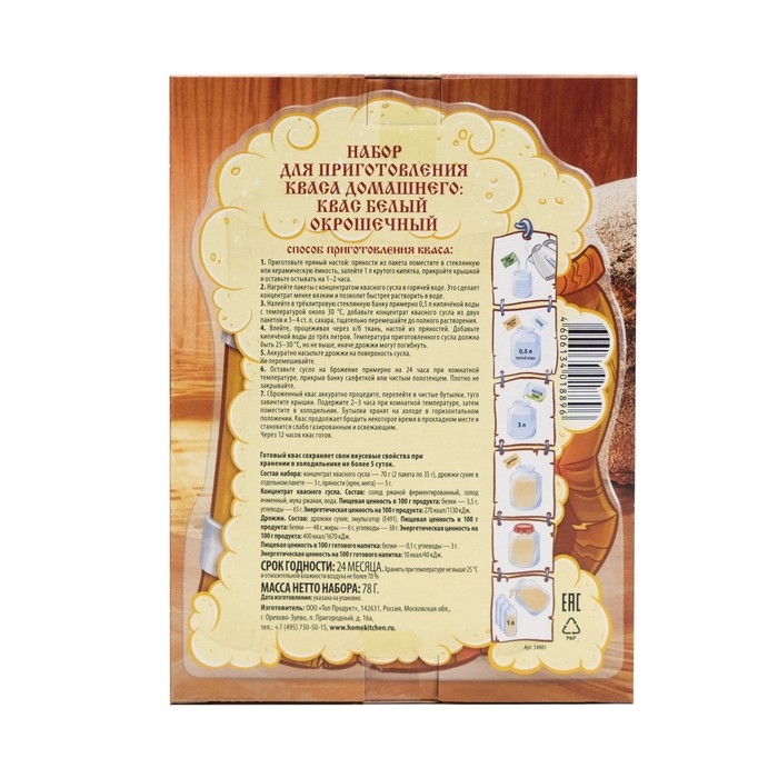 В комплект входит все необходимое для создания натурального и освежающего кваса: концентрат квасного сусла, дрожжи сухие в отдельном пакете, пряности. Простой и понятный процесс приготовления позволит вам включить в это занятие всю семью, делая его увлекательным и познавательным. Вкус свежеприготовленного кваса напомнит о летних днях и праздниках, а возможность контролировать процесс приготовления добавит особую удовольствие от процесса. Благодаря этому набору вы сможете не только насладиться домашним квасом, но и привнести в свою жизнь частичку традиций, которые передавались из поколения в поколение.