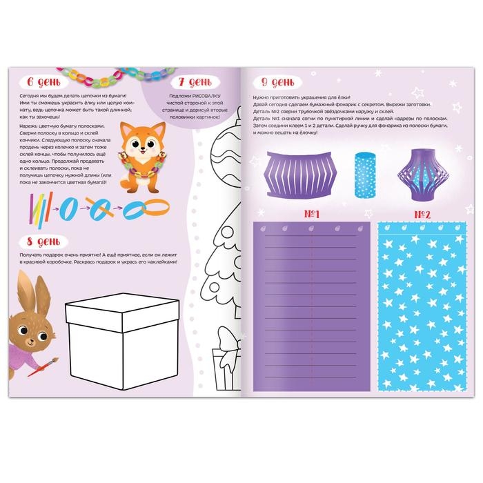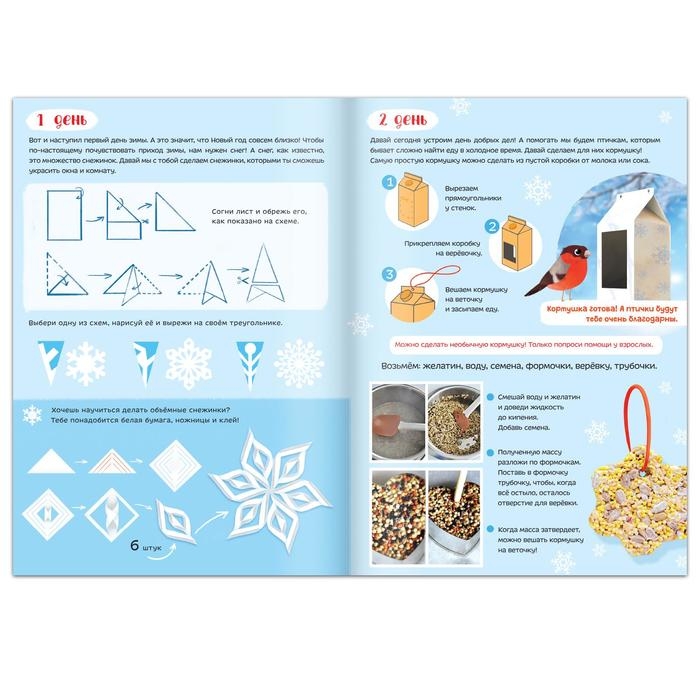 - Внутри вы найдёте 31 задание на каждый день декабря, например написать письмо Деду Морозу, смастерить кормушку, украшение-фонарик и многое другое.
