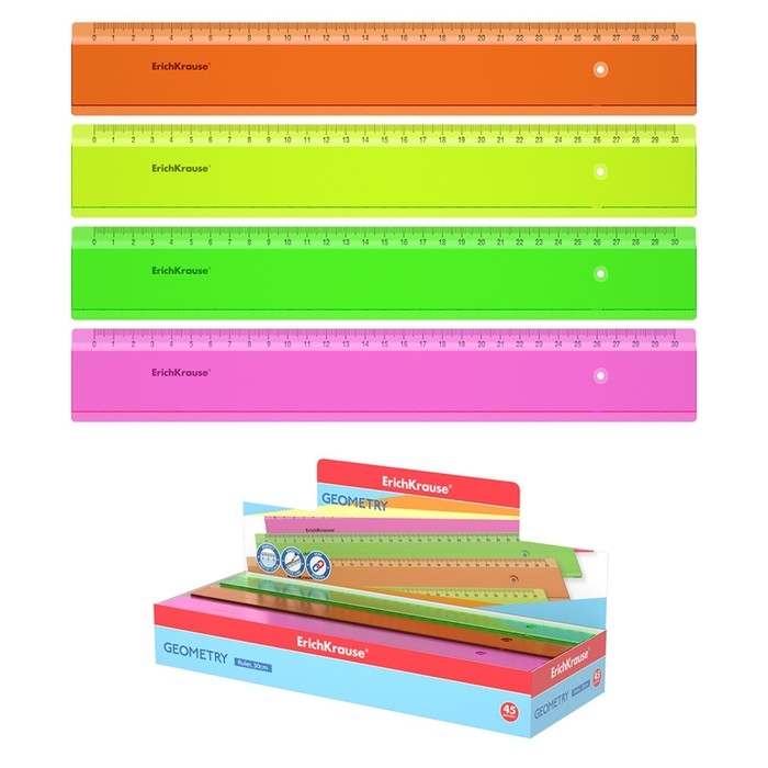 Линейка 30 см ErichKrause Neon, полупрозрачная, пластиковая, МИКС