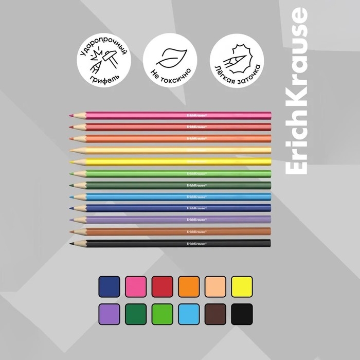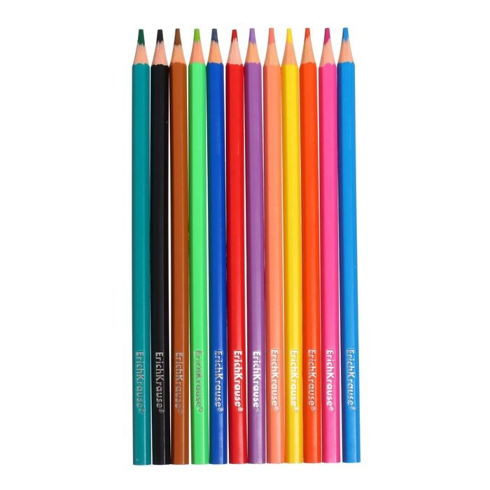 Карандаши 12 цветов, ErichKrause, пластик, шестигранные, 2,6 мм грифель, картонная упаковка, европодвес