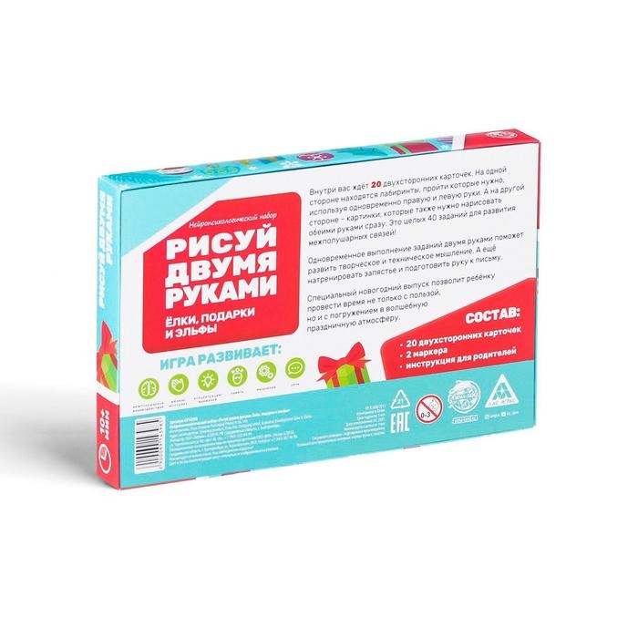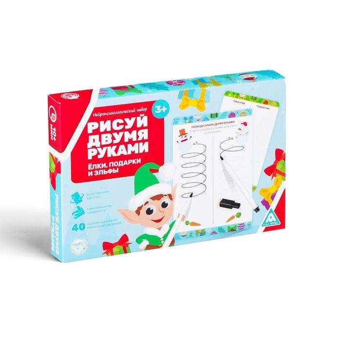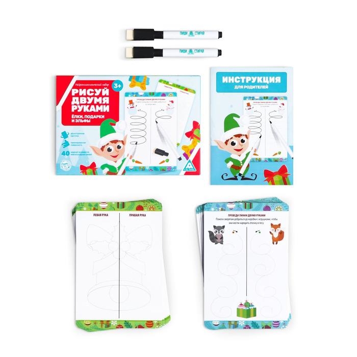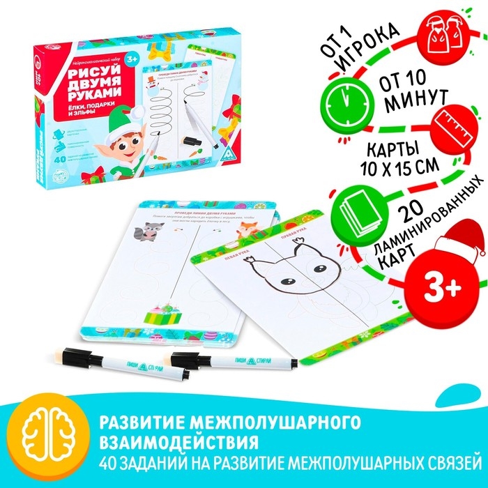 Новогодний набор пиши-стирай «Новый год: Рисуй двумя руками. Ёлки, подарки и эльфы», 20 карт, 3+