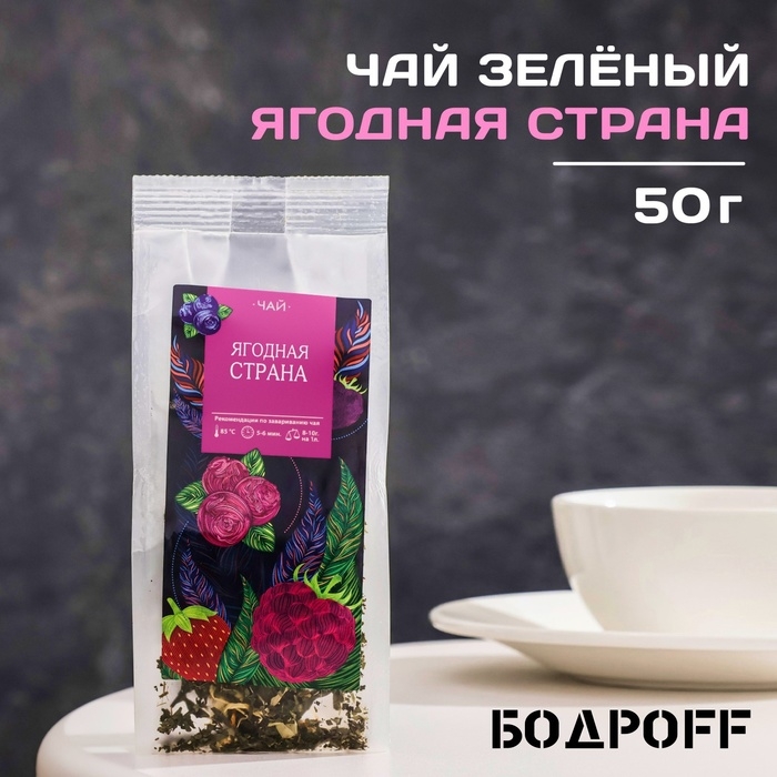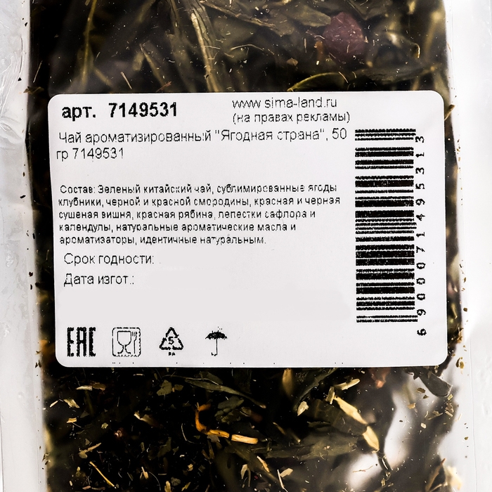Зеленый китайский чай Сенча с добавлением ягод клубники, черной и красной смородины, красной и черной вишни, рябины, лепестков сафлора и календулы.