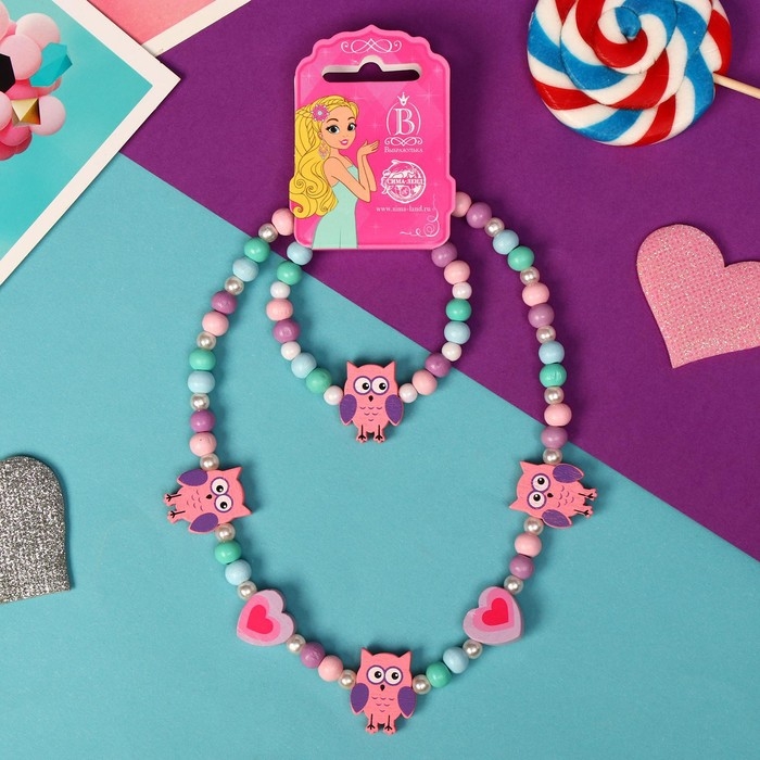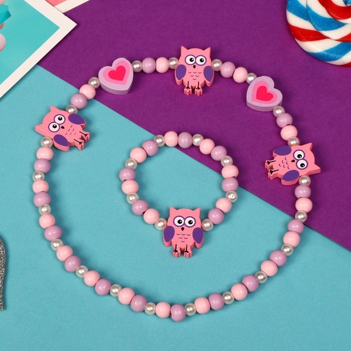 Набор детский «Выбражулька» 2 предмета: бусы, браслет, совы и сердечки, цвет МИКС