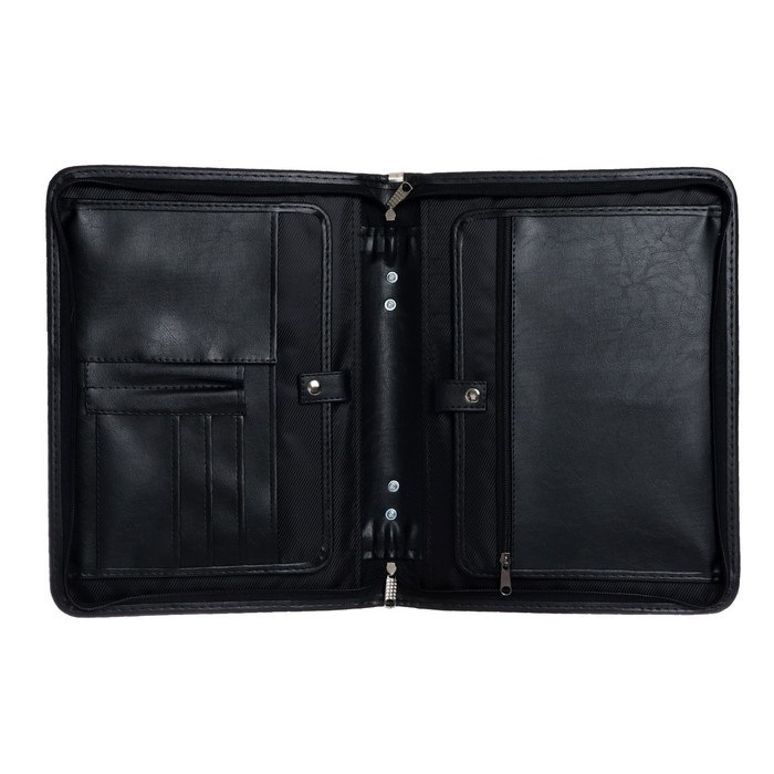 Представительная деловая папка на молнии.Изготовлена из черного К/З Люкс.Размер изделия 270 на 370 мм. Толщина папки - 50 мм.Ручка для удобсва переноса.Внутри расположено удобных, 2 откидных клапана с карманами на молнии, отделение под докумены, везитки и ручки.