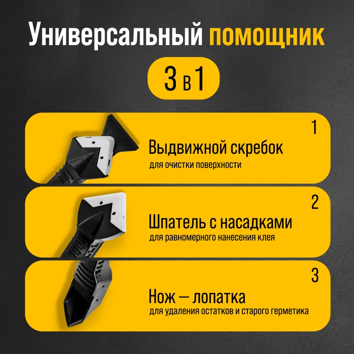 Модель является многофункциональной и удобной в использовании. С одного конца находится скребок, с помощью которого можно удалить лишний герметик из швов. На обратной стороне расположен выдвижной шпатель, который поможет в отчистке поверхности от лишнего герметика.