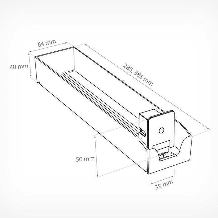 Пластиковый лоток для сигарет с интегрированным толкателем, сила толкания 3 ньютона, 285×64×50 мм