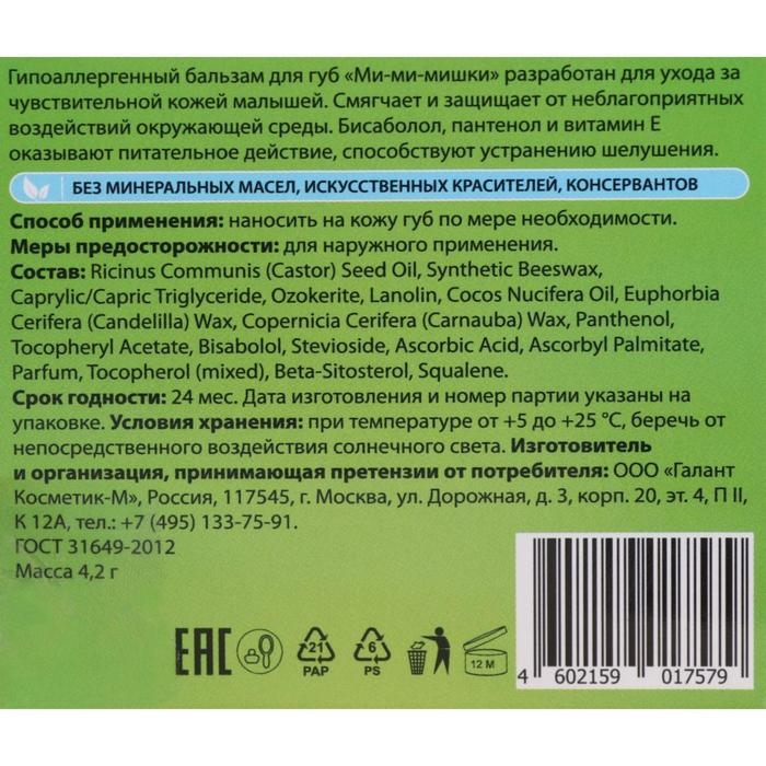 Описание: гипоаллергенный бальзам для губ ""Ми-ми-мишки"" разработан для ухода за чувствительной кожей малышей. Смягчает и защищает от неблагоприятных воздействий окружающей среды. Бисаболол, пантенол и витамин Е оказывают питательное действие, способствуют устранению шелушения.