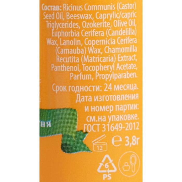 Состав: Ricinus Communis Oil, Cera Alba, Olive Oil, Caprylic/Capric Triglyceride, Ozokerite, Candelilla Cera, Cera Carnauba, Lanolin Oil, Chamomilla Recutita Extract, Tocopheryl Acetate, Pantenol, Propylparaben, Parfum.