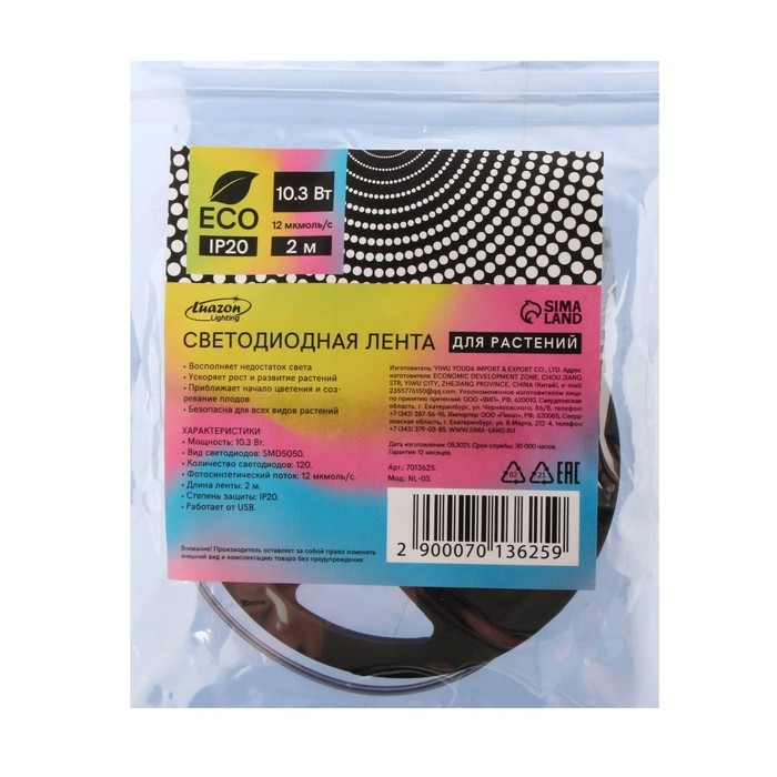 Фитолента светодиодная Luazon, 5 В, SMD5050, 2 м, IP20, 10.3 Вт, 60 LED/м, дим., USB