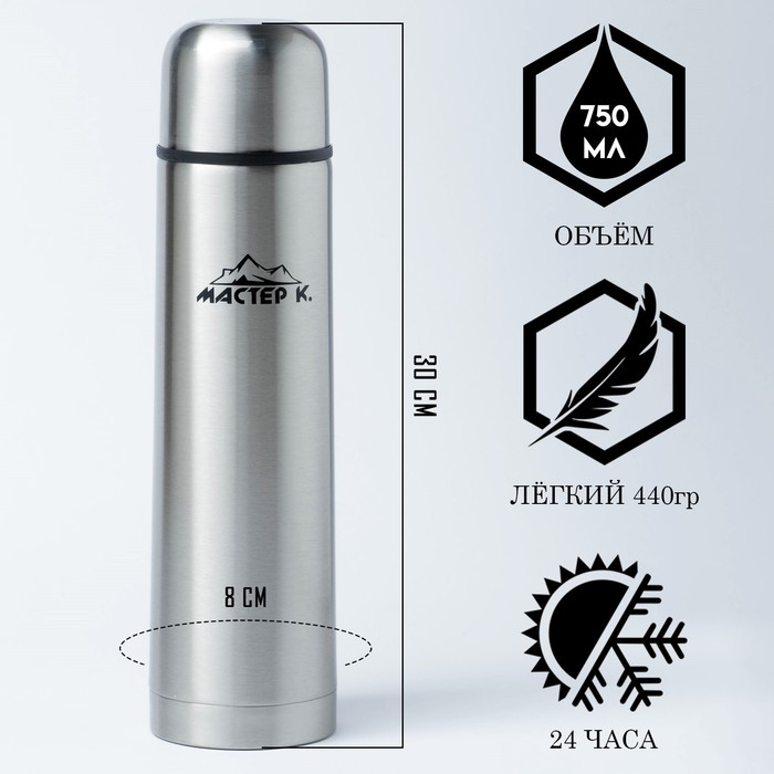 Термос 750 мл "Мастер К" изготовлен из высококачественной нержавеющей стали, имеет двойные стенки, обеспечивающих вакуумную термоизоляцию. Легкий и прочный термос "Мастер К" сохранит ваши напитки горячими или холодными надолго. Это идеальный выбор для тех, кто хочет наслаждаться горячими напитками во время отдыха на природе или в поездках, напиток останется теплым и свежим, готовым к наслаждению в любой момент. Термосы этой серии пользуются большой популярностью у активных и динамичных пользователей, а также у любителей охоты и рыбалки, так как они, сохраняют прочность и термоустойчивость, легки и компактны.
