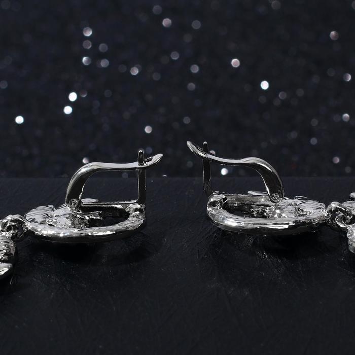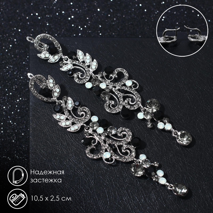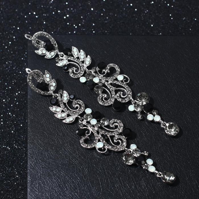 Серьги висячие со стразами «Вечерние» волшебство, цвет чёрно-белый в сером металле, 10,5 см