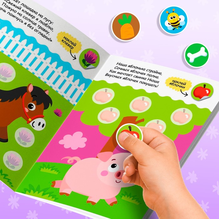 Внутри книг малыша ждут интересные задания, в которых нужно подобрать наклейки по форме, цвету и смыслу и приклеить в определённое место.