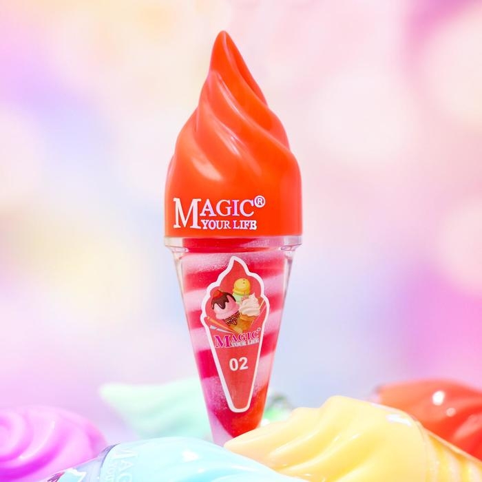 Блеск для губ в упаковке в виде маленького мороженого обладает нежной, тающей текстурой и насыщенным оттенком, который заметно освежает лицо и придаёт губам яркость и выразительность. Он ухаживает за нежной кожей губ, насыщая её необходимыми минералами и витаминами.