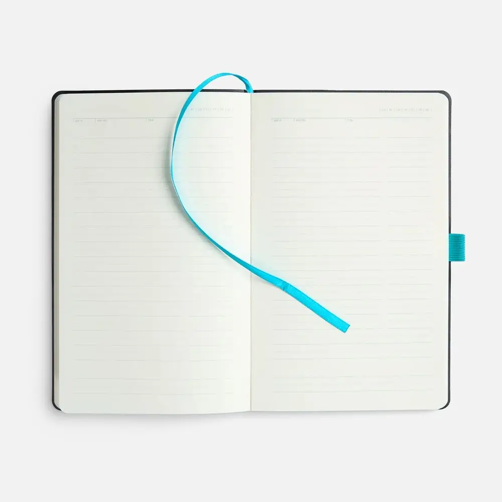 Ежедневник с гибкой обложкой, выполнен из материала Espresso, дополнен цветными ляссе и петлей-резинкой для ручки.