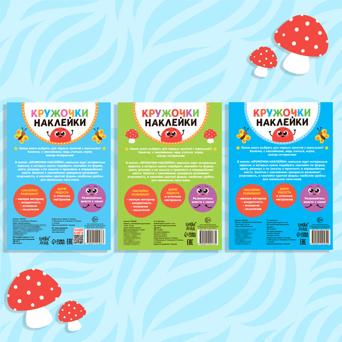 В набор «Умный малыш» входит 3 развивающих книги с наклейками-кружочками на разные темы: