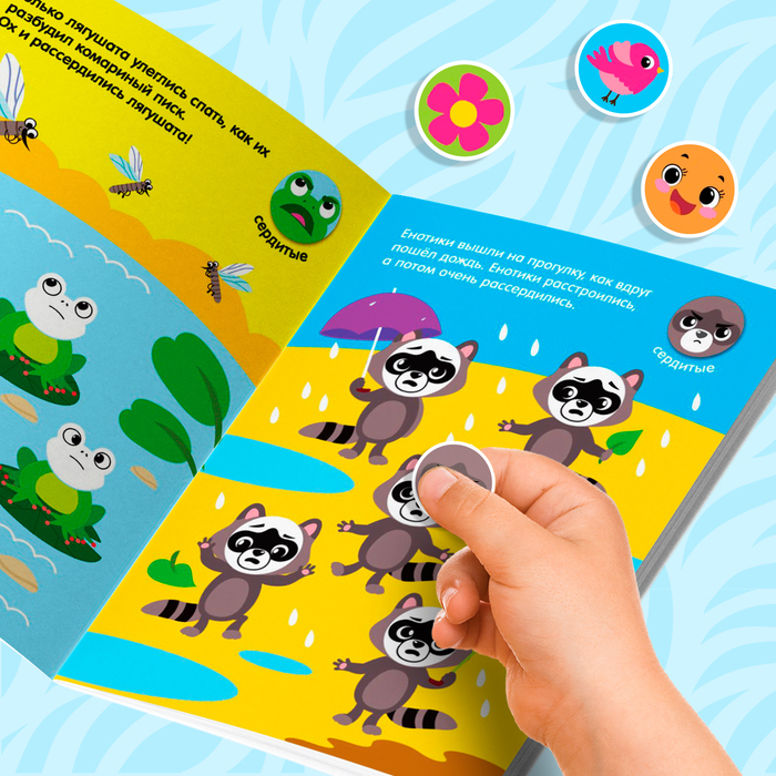 - На каждом развороте книги свой сюжет и небольшая подсказка, куда именно нужно приклеить кружочек.