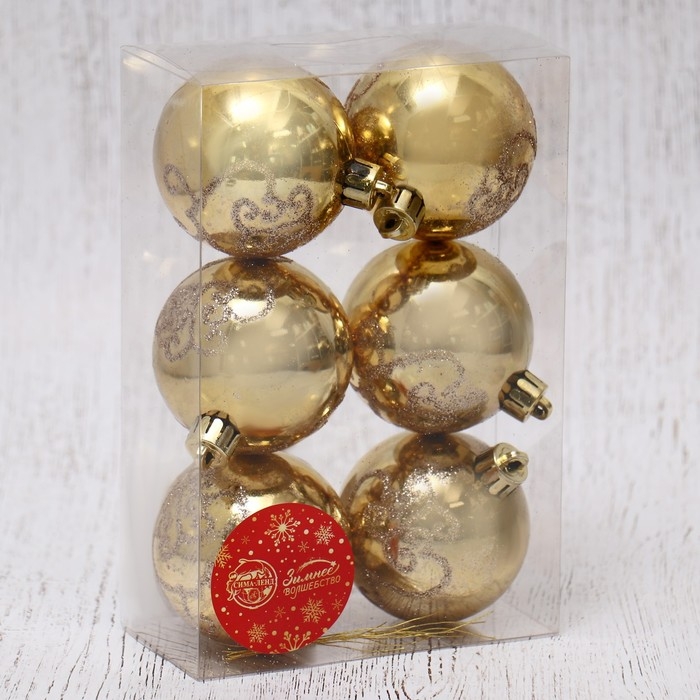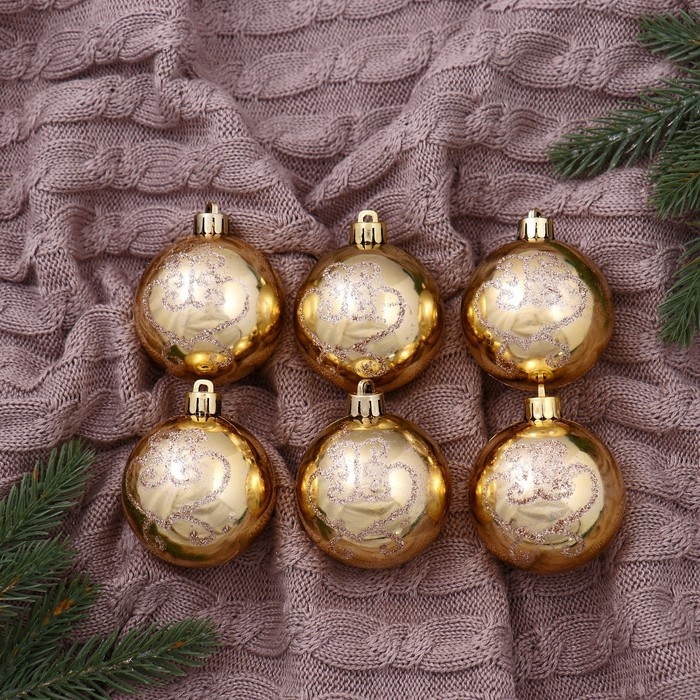 Набор шаров пластик d-6 см, 6 шт "Эмили узоры" золото