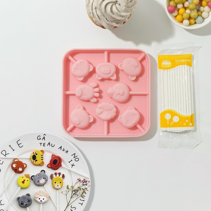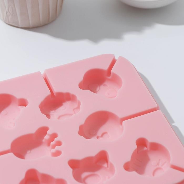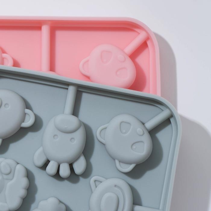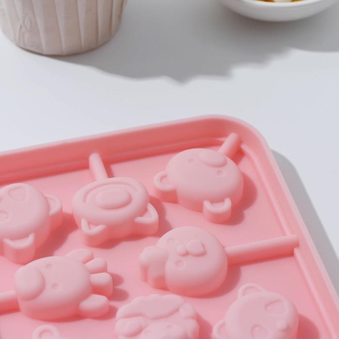 Форма для леденцов «Зверята», силикон, 14×14×1,4 см, 8 ячеек, с палочками, цвет МИКС