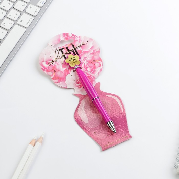 Ручка шариковая синяя паста, пластиковая с цветком «Ты совершенна» на подложке-ваза