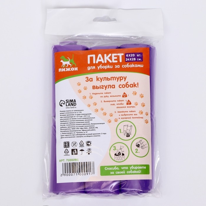 БИО Пакеты "Пижон" для уборки за собаками, 20 х 30 см, 8 мкм, 6 х 20 шт, фиолетовые