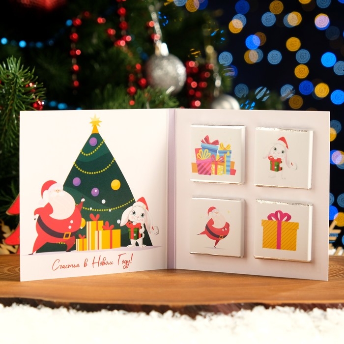 Шоколадная открытка – необычный и оригинальный способ поздравить с Новым годом! В ассортименте представлены интересные, забавные пожелания на любой вкус. Внутри каждой открытки вы найдёте маленькую шоколадку из настоящего шоколада высокого качества от российских и бельгийских производителей. Благодаря качественному составу, ваш сюрприз будет не только красивым, но и действительно вкусным!