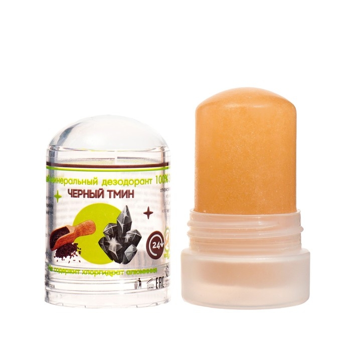 Минеральный дезодорант «Масло черного тмина». Представляет собой натуральный кристалл алунит, обладающий высокой антибактериальной активностью. Предотвращает появление пота и неприятного запаха в течение всего дня. Заживляет ранки и увлажняет.