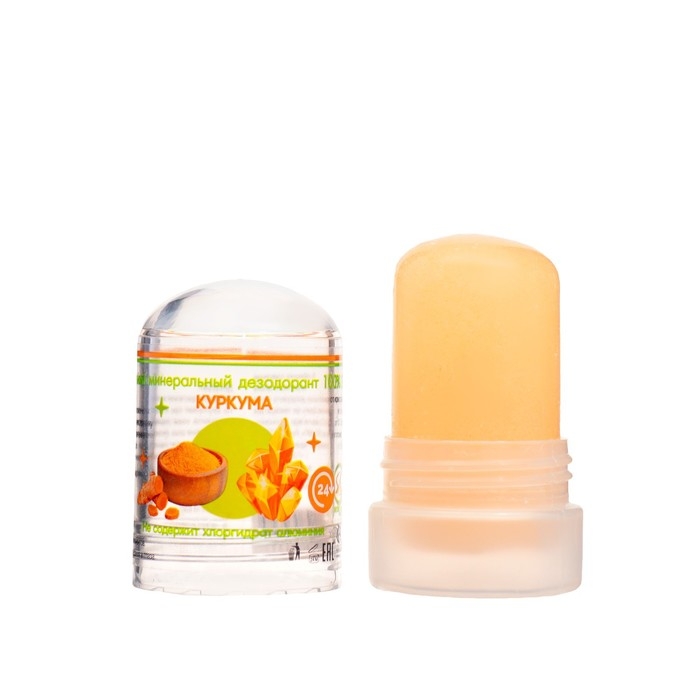 Минеральный дезодорант «Куркума». Представляет собой натуральный кристалл алунит, обладающий высокой антибактериальной активностью. Предотвращает появление пота и неприятного запаха в течение всего дня. Заживляет ранки и увлажняет.
