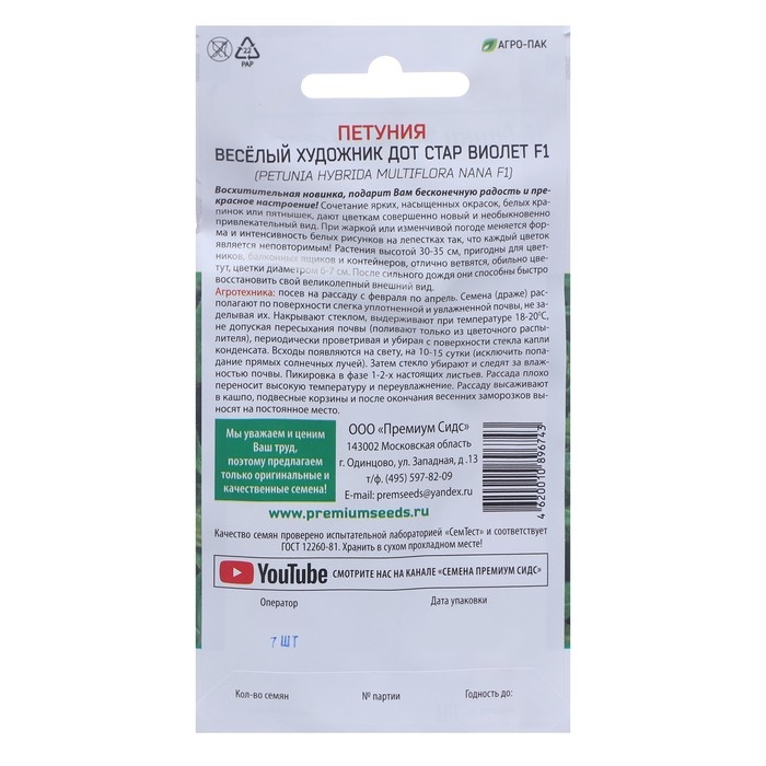 Семена цветов Петуния многоцветковая Весёлый художник Дот Стар Виолет F1 7 шт.