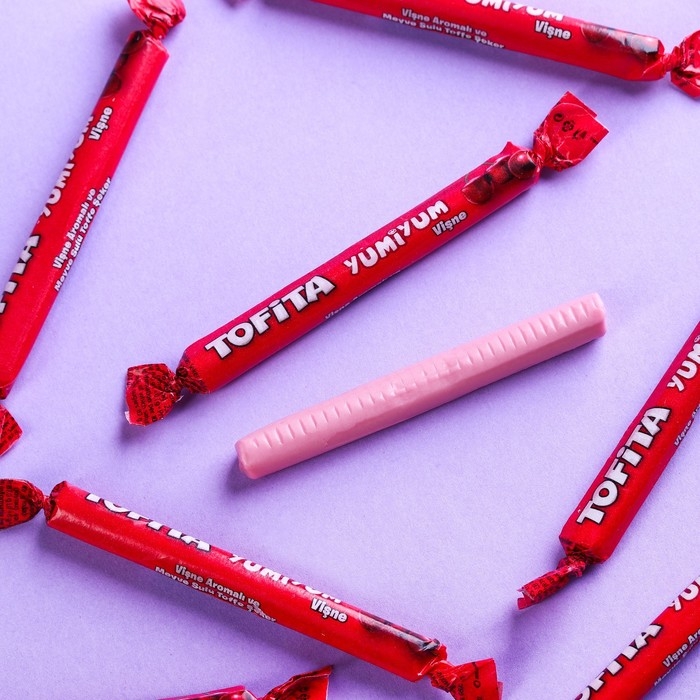 Состав: сахар, сироп глюкозный, масло растительное (пальмовое), регулятор кислотности (лимонная кислота), желатин говяжий, концентрат сока клубники (0,3 %), концентрат сока вишни (0,4 %), концентрат соков апельсина и лимона (0,2 %), эмульгаторы (Е471, лецитин подсолнечный), ароматизатор искусственный, идентичный натуральному, краситель (красный свекольный, Е160а).