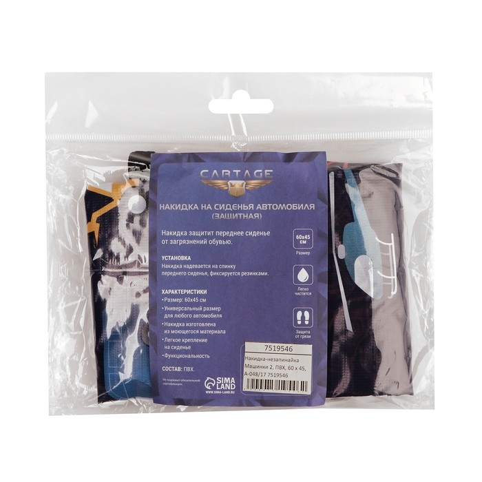 Накидки на сиденья автомобиля от бренда Cartage - это стильная и надежная защита кресел салона от загрязнения, царапин, истирания. Данная модель-незапинайка предназначена в первую очередь для защиты спинки переднего сиденья от обуви ребенка и от лап животных. Защитные накидки универсальны, подходят для любых марок автомобилей. Размер накидки 60 х 45 см. Благодаря яркому дизайну с качественной печатью, накидка украсит салон автомобиля и превратит поездку ребёнка в увлекательное путешествие. На выбор - различные варианты расцветок. Накидка-незапинайка Cartage выполнена из прочного материала, который не впитывает влагу и загрязнения, стойкий к истиранию, механическим повреждениям и царапинам. Легко очищается без специальных средств и не требует стирки.