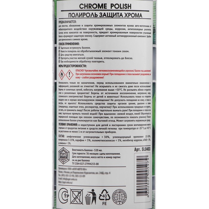 Средство предназначено для очистки, обновления и защиты хромированных элементов кузова авто-мототехники от неблагоприятного воздействия окружающей среды, коррозии, антигололедных реагентов. Специально разработанный состав легко наносится на поверхность, формирует защитную пленку и придает хромированным элементам утраченный блеск. Кроме того, препарат содержит активный антикоррозионный комплекс, защищающий поверхность от появления очагов коррозии. Удобен для применения в зимнее время. Полироль «Защита хрома» защищает и продлевает «жизнь» хромированного покрытия!