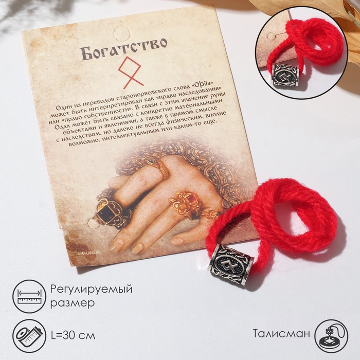 Браслет-амулет на нити «Красная нить» руна богатство, цвет красный с чернёным серебром, 30 см