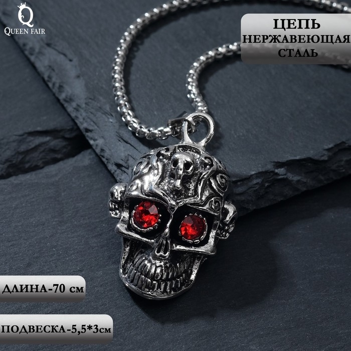 Кулон «Череп с узорами» яркие глаза, цвет красный в чернёном серебре, 70 см