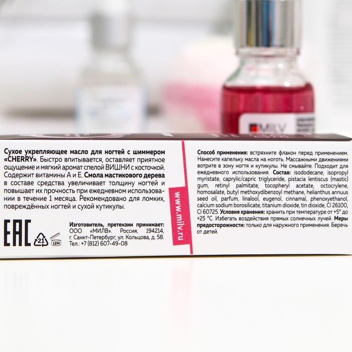 Сухое укрепляющее масло для ногтей с шиммером «Cherry» приятно наносить на кожу. Лёгкая консистенция обеспечивает быстрое и глубокое впитывание, оставляя на коже бархатистое ощущение. Благодаря специально разработанной формуле масло защищает от сухости, питает, придаёт рукам ухоженный вид, при этом не оставляет липких следов, жирного блеска и ощущения плёнки. Блестящий уход и обогащение: смола мастикового дерева в составе средства повышает прочность ногтей при ежедневном использовании в течение 1 месяца, мелкие частицы придают коже мерцающее сияние.