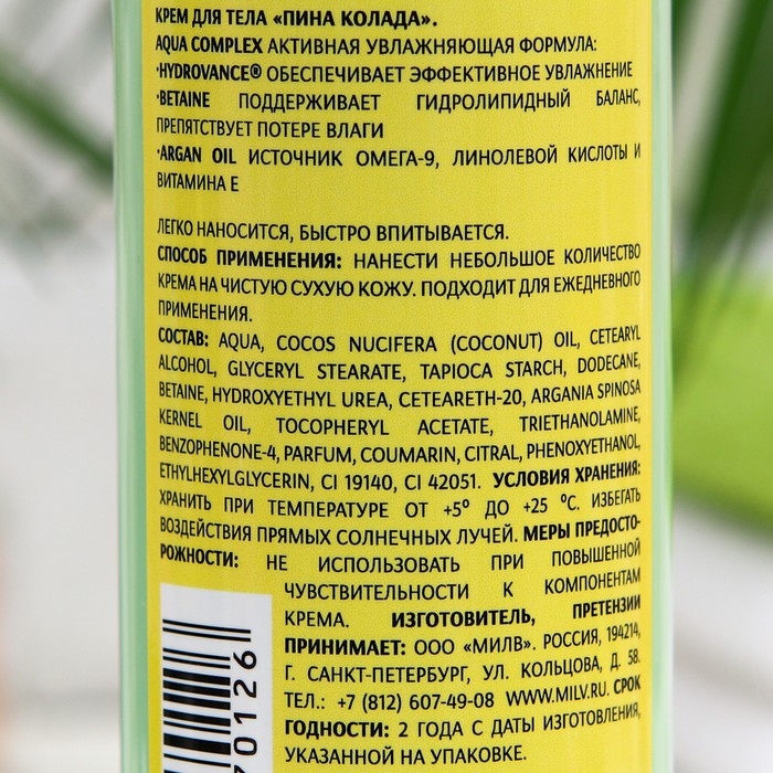Крем для тела Milv, пина колада, 250 мл