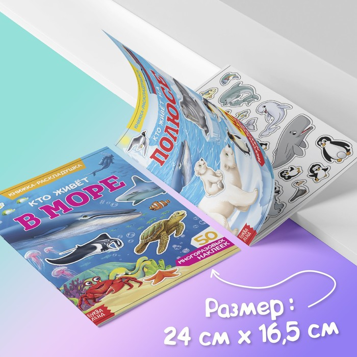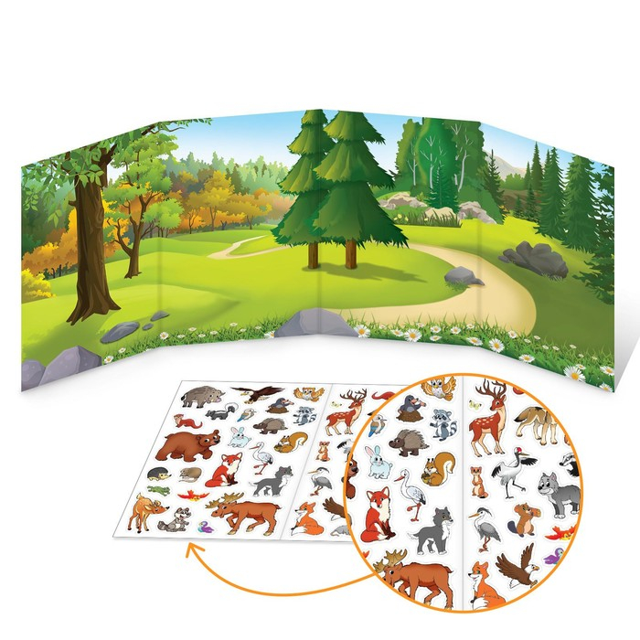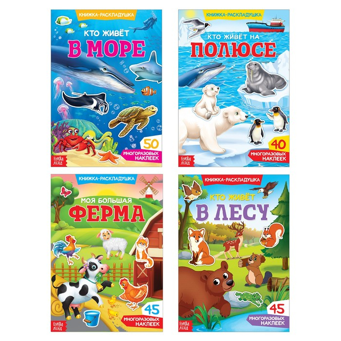 Набор многоразовых детских наклеек «Изучаем животных» включает 4 издания разной тематики: «Кто живёт в море», «Кто живёт на полюсе», «Моя большая ферма» и «Кто живёт в лесу».