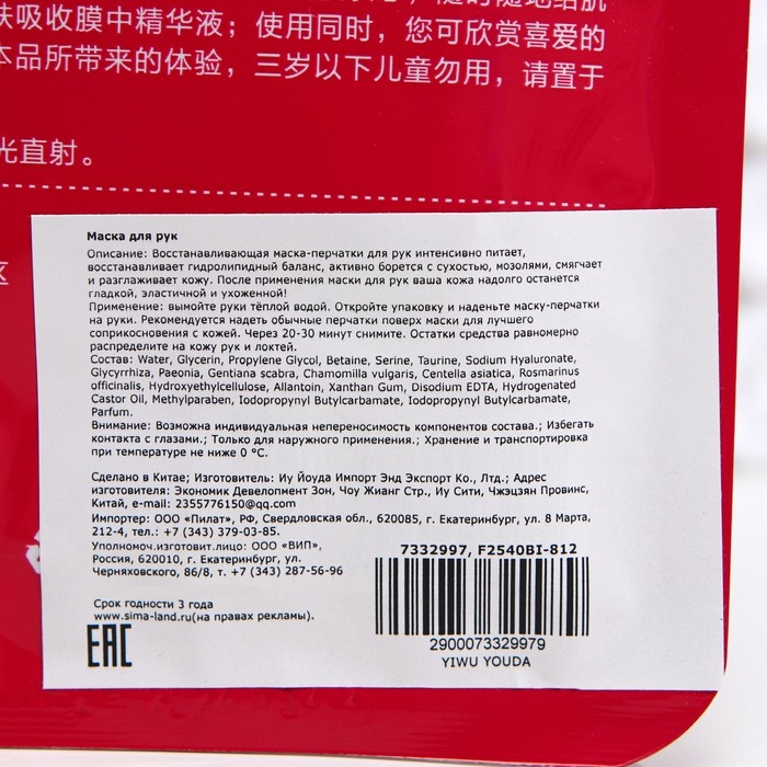 Способ применения: вымойте руки тёплой водой. Откройте упаковку и наденьте маску-перчатки на руки. Рекомендуется надеть обычные перчатки поверх маски для лучшего соприкосновения с кожей. Через 20-30 минут снимите. Остатки средства равномерно распределите на кожу рук и локтей.