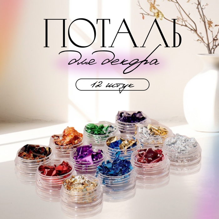 Создайте неповторимый образ с помощью набора потали «Ассорти», состоящего из 12 разноцветных оттенков. Этот набор — идеальное решение для тех, кто стремится выделиться ярким маникюром и придать ногтям эффектный блеск и текстуру без использования блёсток. Поталь можно использовать как для акцентного дизайна, так и для полного покрытия ногтевой пластины, открывая безграничные возможности для вашего творчества.
