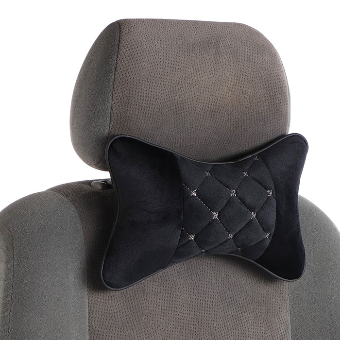 Подушка автомобильная косточка, на подголовник, 27×17 см, велюр, чёрный с строчкой