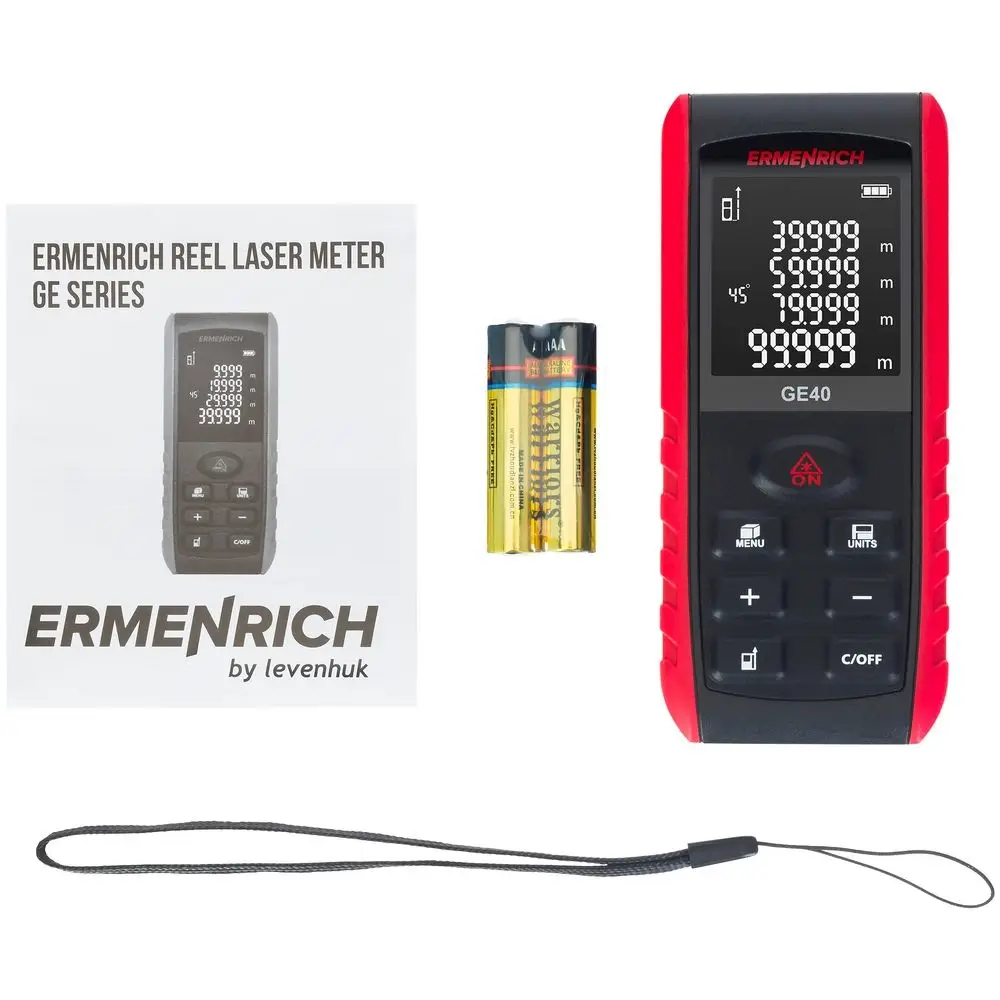 Ermenrich Reel GE40 — лазерная рулетка для самого широкого применения при измерении линейных размеров, площадей и объемов помещений, зданий и сооружений.